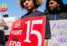 Workers in Flint, Michigan protest in favor of a $15 minimum wage. (Jake May/The Flint Journal via AP)