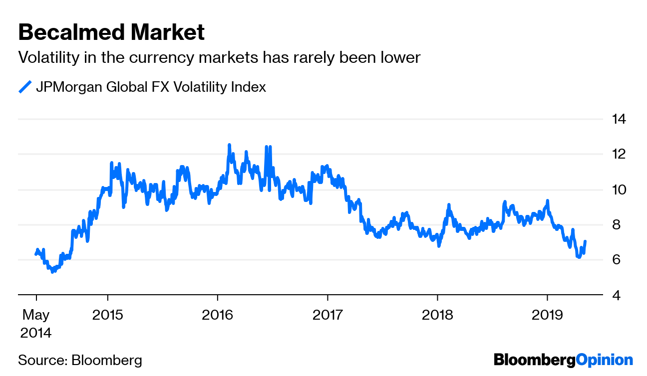 structural changes that have made the currency market more about flash volatility events due to specific gaps in liquidity, according to Bloomberg News’s Liz Capo McCormick. Positioning dynamics and recent idiosyncratic forces (aside from Trump’s rhetoric) are also capping fluctuations, she adds. “What the market tends to experience more now is not a rise when it happens in all assets but instead flash-crash episodes,” Steve Barrow, head of currency strategy at Standard Bank, told Bloomberg News. “Currencies that are moving, such as those in emerging markets, are due to specific domestic factors.” The thing to know here is that more than $5 trillion of currencies trade each day, making it the deepest, most liquid market in the world. So the fact that the market is in a state of relative calm should be a reassuring signal, and that the U.S. and China will ultimately come to a trade deal without causing too much more damage to the global economy.