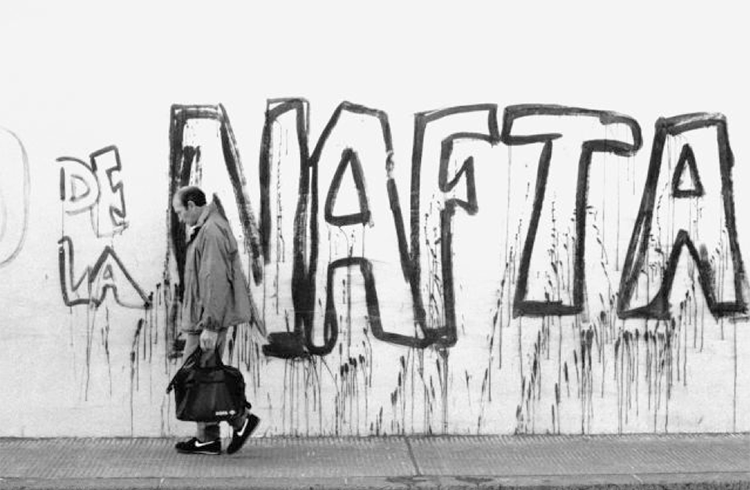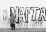 In Buenos Aires, a man in Nikes walks in front of “NAFTA” graffiti. (Photo by Woody Wood.)