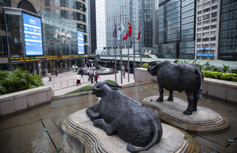 Sculptures of water buffaloes stand outside the Exchange Square complex, which houses the Hong Kong Stock Exchange, in Hong Kong. Photographer: Justin Chin/Bloomberg