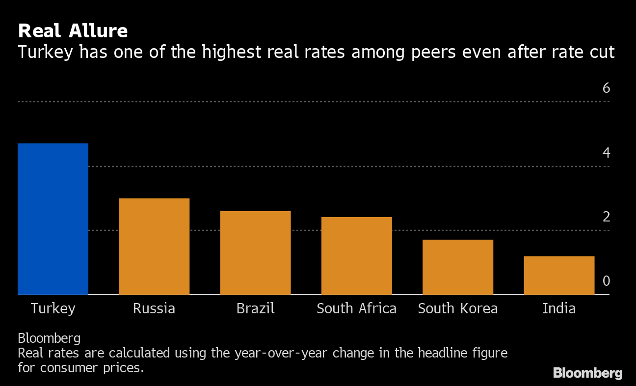 Turkish assets could be at risk if rate cuts start to erode their appeal in real terms just as inflation quickens. Adjusted for prices, Turkish rates are still among the highest in emerging markets.