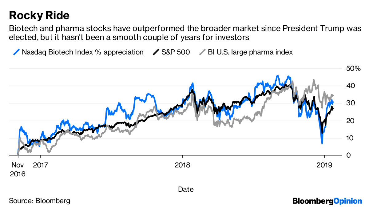 Biotech and pharma stocks have outperformed the broader market since President Trump was elected, but it hasn’t been a smooth couple of years for investors