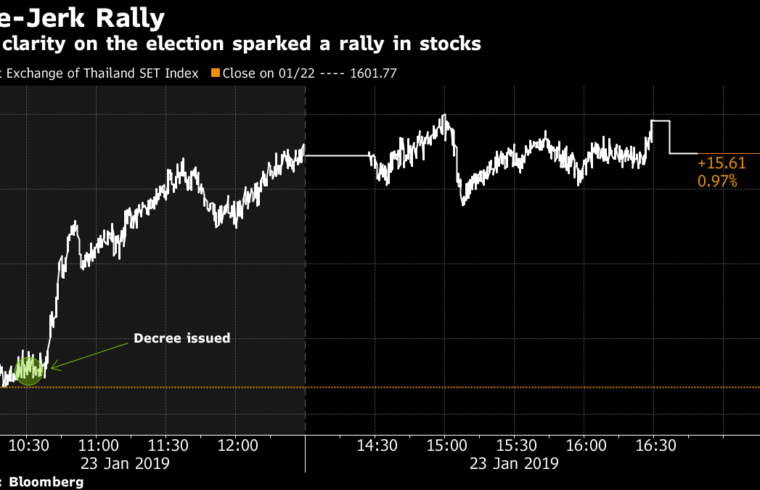 “The announcement was a knee-jerk boost to market sentiment after a long wait for some clarity on the election,” said Poramet Tongbua, a strategist at Bualuang Securities Pcl in Bangkok. “But any further gains will be limited as there’s uncertainty about the outcome of the vote. The stability of the next government may be the main worry.”