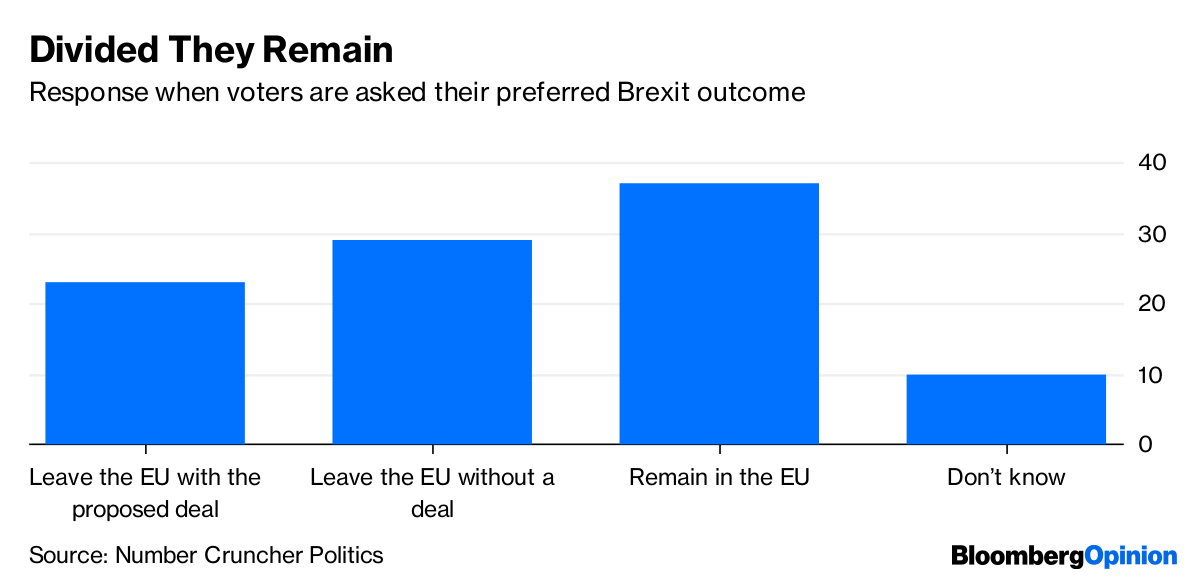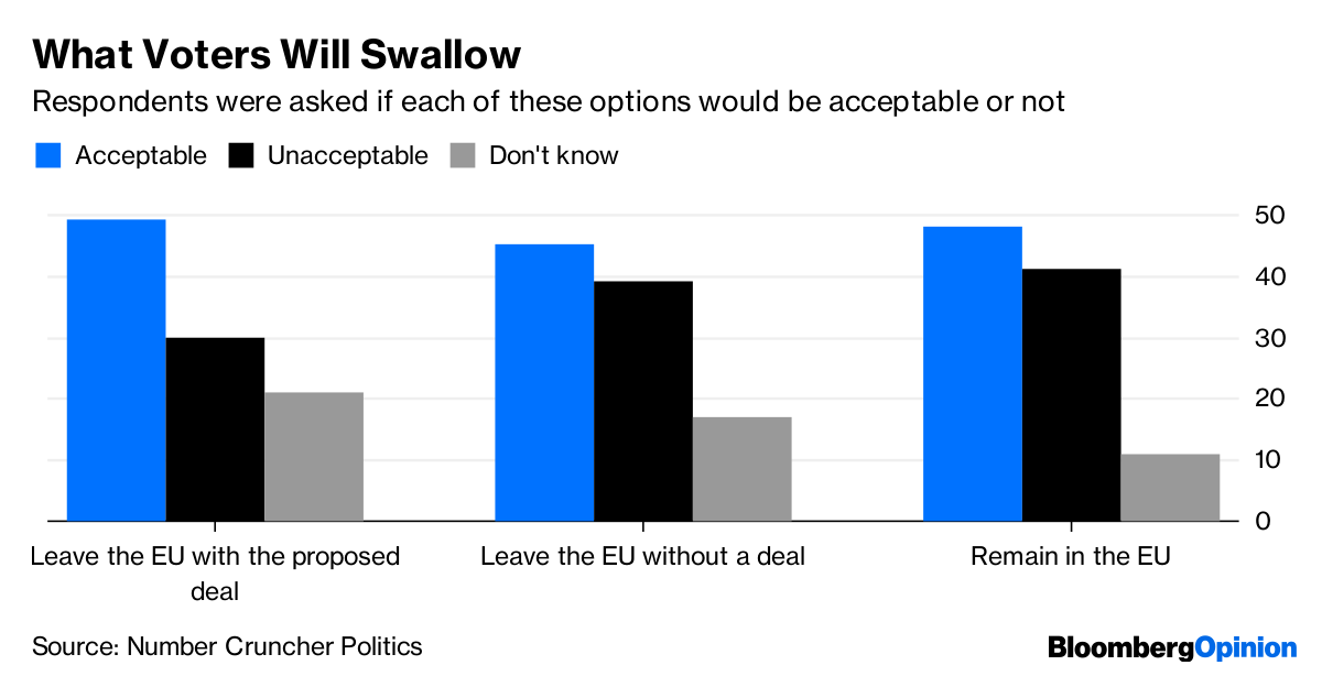 Polling so far, quite reasonably, has asked people whether the Brexit deal negotiated by Theresa May and rejected by parliament so convincingly last week is “good” or “bad.” It also asks which of three currently feasible endpoints — May’s deal, no deal at all or no Brexit — respondents prefer. But what people would like and what they could live with are often quite different things.