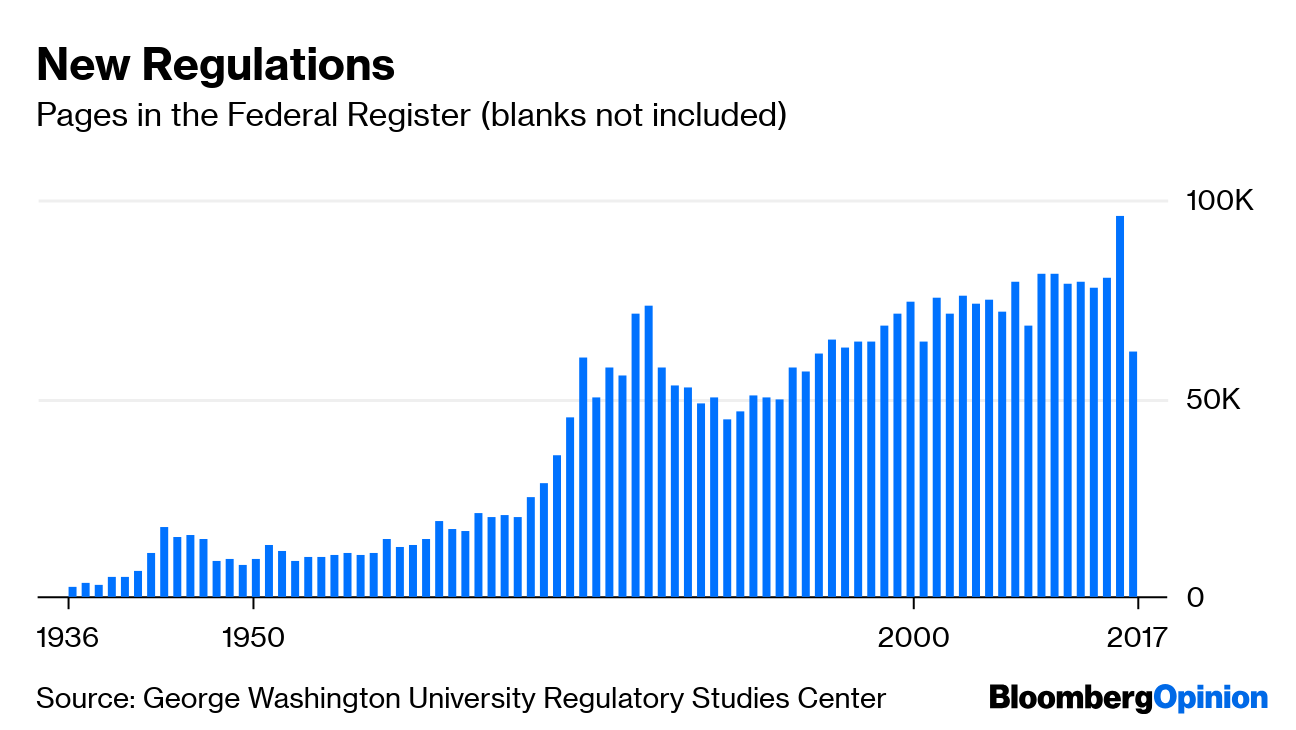 That’s a pretty spectacular drop in 2017, President Donald Trump’s first year in office. It represents less a regulatory rollback, though, than a lack of new regulations (also, interestingly, President Barack Obama presided over a decline in Federal Register pages in his first year in office too, albeit a much smaller one). It’s the Code of Federal Regulations that will give a sense of whether overall regulatory verbiage has actually declined, and the 2017 totals haven’t been tallied. It seems unlikely that they will show a big decline, though.