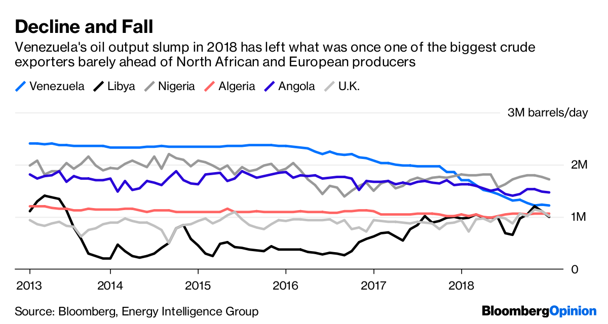 Venezuela’s oil output slump in 2018 has left what was once one of the biggest crude exporters barely ahead of North African and European producers