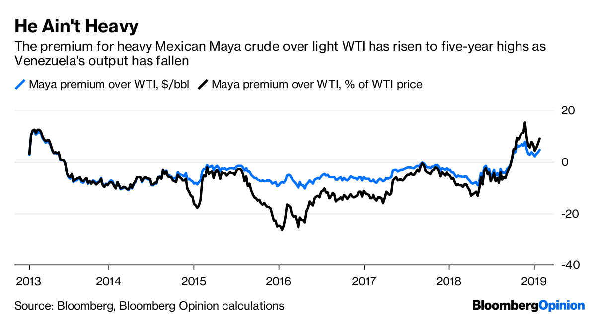 changing regulations on shipping emissions. The decline of Venezuelan production and the difficulty of getting product out of Canada’s prairies means they’re running out of options. Maya crude, a Mexican variety that’s the best heavy crude option for American refiners to mix with light domestic product, rose to its biggest premium over WTI in five years in November.